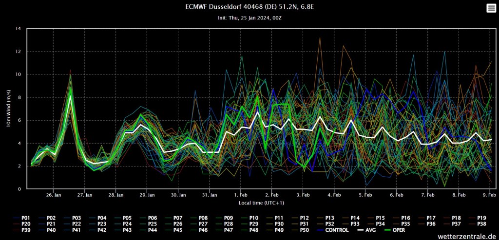 Ein Chart habe ich noch für euch, das Wind-Chart. Wir sehen zum einen die Kaltfront morgen Mittag, wir sehen auch den Abfall des Windes im Anschluss. Interessant wird es mit dem Monatswechsel. Wir rufen uns einmal in Erinnerung: Ab dem Monatswechsel deutlich mehr Regen und auch langsam kälter werdende Temperaturen. Dazu soll auch der Wind dann ein stetiger Begleiter sein mit gemittelt 20 km/h, sprich 40-55 km/h in Böen. Lebhaft ja, einzelne Modelle bauen auch mal einen Sturm ein, aber alles ganz im Rahmen von: Wechselhaft, mildes Winterwetter. Nichts außergewöhnliches.