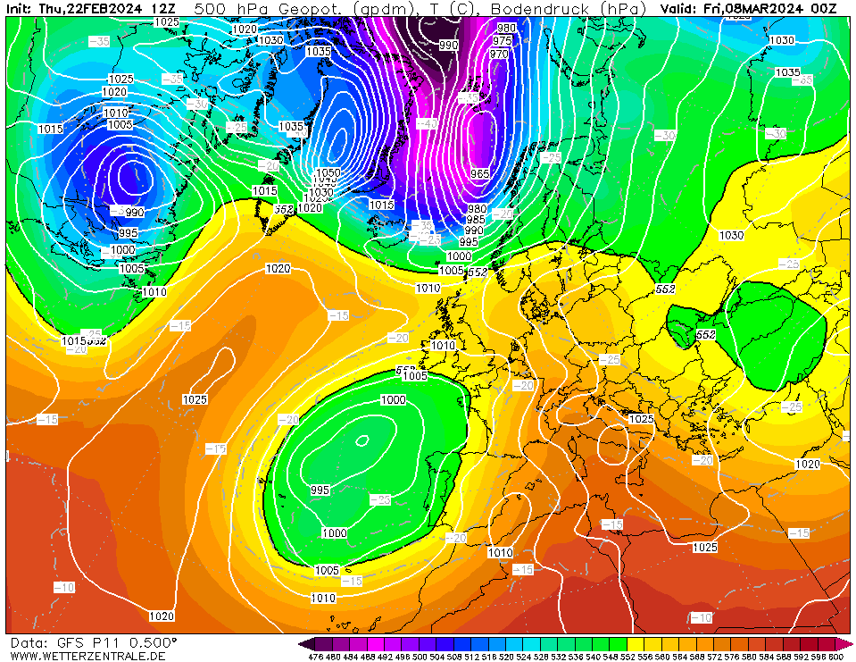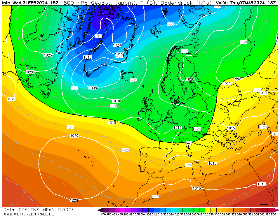 Der mildeste Lauf sieht derweil so aus. Tiefdruck nordöstlich von Island, nach Nord verlagertes Hoch der Azoren und ein Tief vor Portugal und Spanien. Außerdem noch schwacher Hochdruck über der Adria und schon haben wir eine südliche Strömung mit einer äußerst milden Luftmasse, zeitweise mit Sonne, meist mit Schauern. Die Großwetterlage ist gar nicht groß unterschiedlich zwischen dem Hauptlauf und dem P11, weil sie die gleiche Struktur aufweisen. Lediglich das Hoch auf dem Atlantik liegt anders und entscheidet über Warm und kalt, freundlich oder dümpelig, trockener oder nass. Das gucken wir uns morgen im Trend nochmal etwas genauer an.
