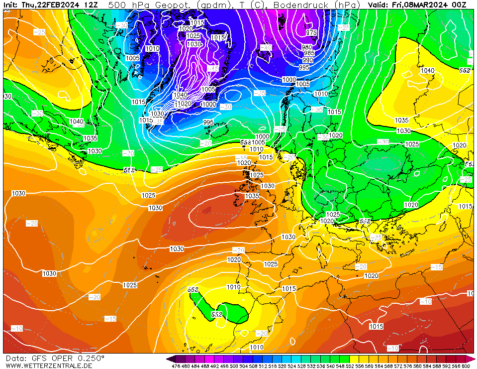 Un dieses Modell ist hochspannend. Nicht nur, dass dieses Modell die besten Daten zur Verfügung gestellt bekommt, um am Besten das Wetter „berechnen“ zu können, hat es auch viel wildes im Gepäck. Da wäre zum einen das Island-Tief, was sich sehr nach Norden abdrängen lässt vom Azoren-Hoch, welches seinerseits Tiefdruck Platz lässt sich vor den toren Südwesteuropas zu entfalten. Ein weiteres Hoch über dem Kontinent lässt auf eine schwache Hochdruckbrücke mit Tiefdruckeinfluss in der Höhe schließen, was für mildes Dümpelwetter sprechen würde. Fast, denn das ist tatsächlich aktuell der kälteste Lauf, da auf der Vorderseite des Hochs eisige Polarluft aus dem Norden zu uns kommt mit Nachtfrostgefahr, die auch wenig später wieder abziehen würde.