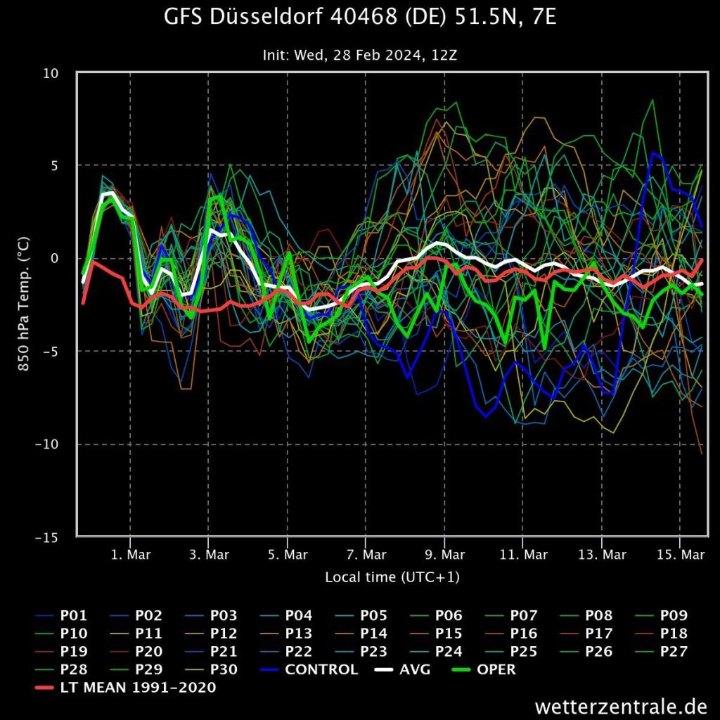 Es ist ja durchaus die Rede davon, dass es nochmal einen deutlichen Wintereinbruch geben könnte aufgrund des Kaltevorstoßes in über 20 km Höhe. Das, was da in 35 km Höhe passiert, kann in untere Luftschichtebenen durchgegeben werden, sodass sich diese Kälte dann wochenverzögert auch bei uns durchsetzen würde. Darüber wird aktuell viel spekuliert. Nach dem Mittel des amerikanischen GFS ist der Einbruch nur so bedingt erkennbar, da gerade nach dem 7. März viele Modelle nach unten gehen und tatsächlich eisige Luft bringen würden, die Hälfte der anderen Modelle machen es hingegen richtig mild. Ein eindeutiger Trend lässt sich da nicht erkennen.