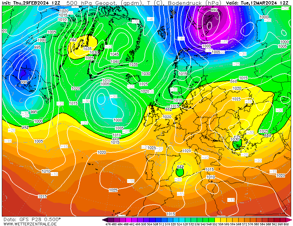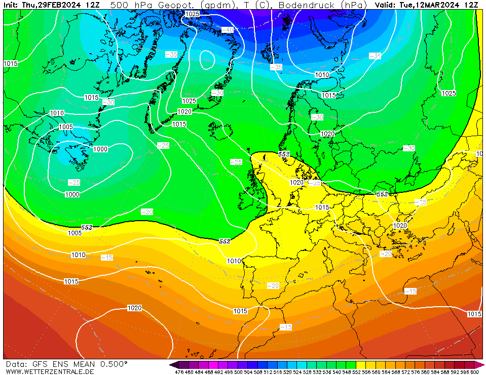 Wie in der Einleitung schon erwähnt soll sich zum Wochenende der nächsten Woche der Frühling aufbauen. Ein Blick auf die gemittelte Großwetterlage für den Wochenstart der übernächsten Woche zeigt ein schwaches Bodenhoch über uns mit einer schwachen Höhenhochstruktur in 5.500 Meter Höhe. Das erkennen wir an der gelben Markierung über Deutschland und der schwarzen Linie als Abgrenzung zur grünen Einfärbung. Hier ist ein Omega zu erkennen, sodass auf eine stabile Hochdrucklage geschlossen werden kann. Bis dahin könnte sich diese aufbauende Struktur bereits wieder abschwächen.
