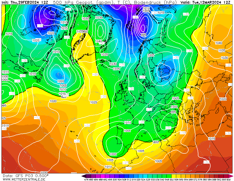 Die kälteste Variante mit knapp -10 °C in 1.500 Meter Höhe mit strengem Nachtfrost und leichten positiven Tageshöchstwerten weist eine ähnliche Struktur auf. Dazu liegt das Hoch über den Azoren leicht nach Nord verlagert, wir haben aber sowohl ein Osteuropa Hoch, auch wenn dieses weiter über dem Kontinent liegt und ein Tief über Südeuropa. In diesem Fall würden die Tiefs die Brücke schlagen zum tiefgeprägtem Nordeuropa.