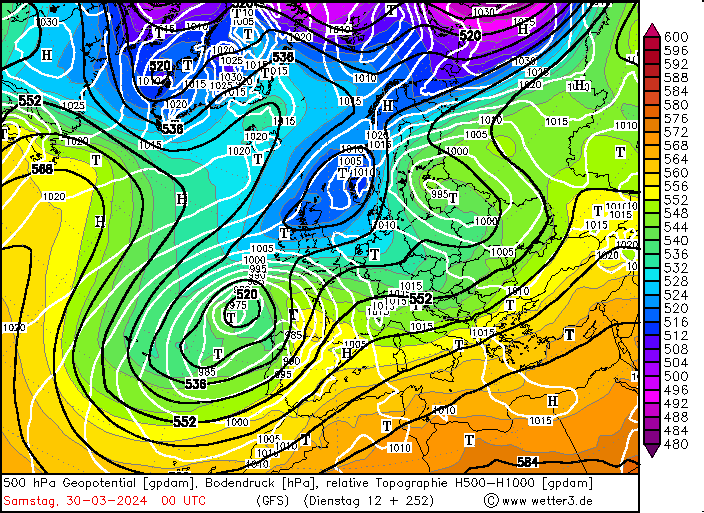 Gestern sprach ich ja bereits von einer neuen milden Phase rund um den Monatswechsel und das verbirgt sich dahinter: Der Großteil von Europa ist von Tiefdruck geprägt, der sich von Nordeuropa über den Azoren, Portugal / Spanien, Nordsee, Mitteleuropa bis nach Osteuropa erstreckt. Von Norden strömt weiter kühle Luft zu uns mit -6 °C in 1.500 Meter Höhe, was uns gerade so frostfrei belässt, von Südwesten drückt das Tief vor Portugal hingegen sehr milde Luft mit über 10 °C in 1.500 Meter Höhe in unsere Richtung. Nach den Modellen soll sich das Tief bei Portugal durchsetzen und uns milde Luft mit Regen bringen, einzelne Modelle lassen es hingegen kalt. Das werde ich über die Woche im Auge behalten.