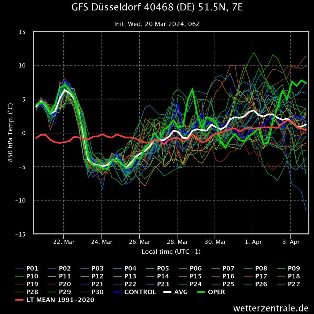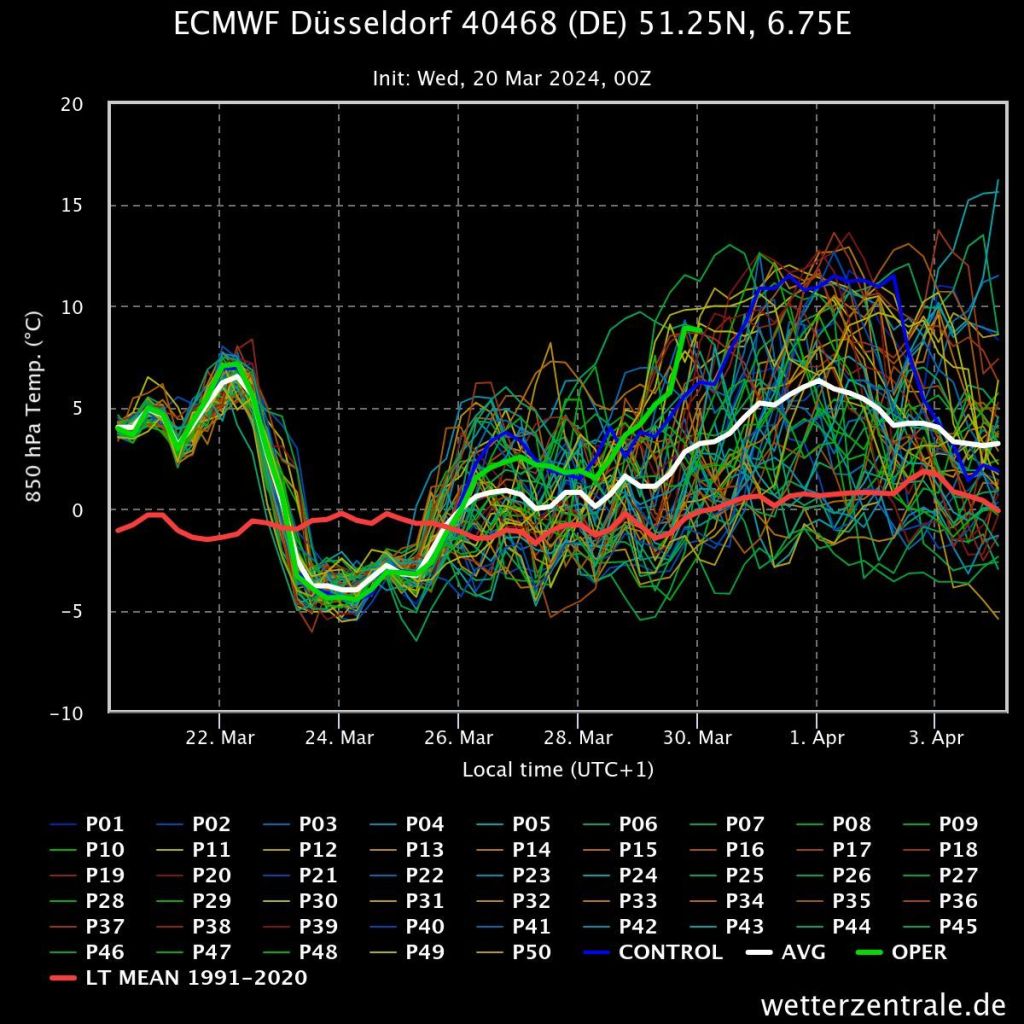 Das europäische ECMWF geht diesen Trend mit, aber: Die kühlsten Läufe sind mit -2 °C leicht wärmer, das Mittel mit +6 °C deutlicher wärmer und der wärmste Lauf mit +13 °C etwas wärmer. Das ECMWF insgesamt sieht den Wärmevorstoß rund um den Monatswechsel ausgeprägter.