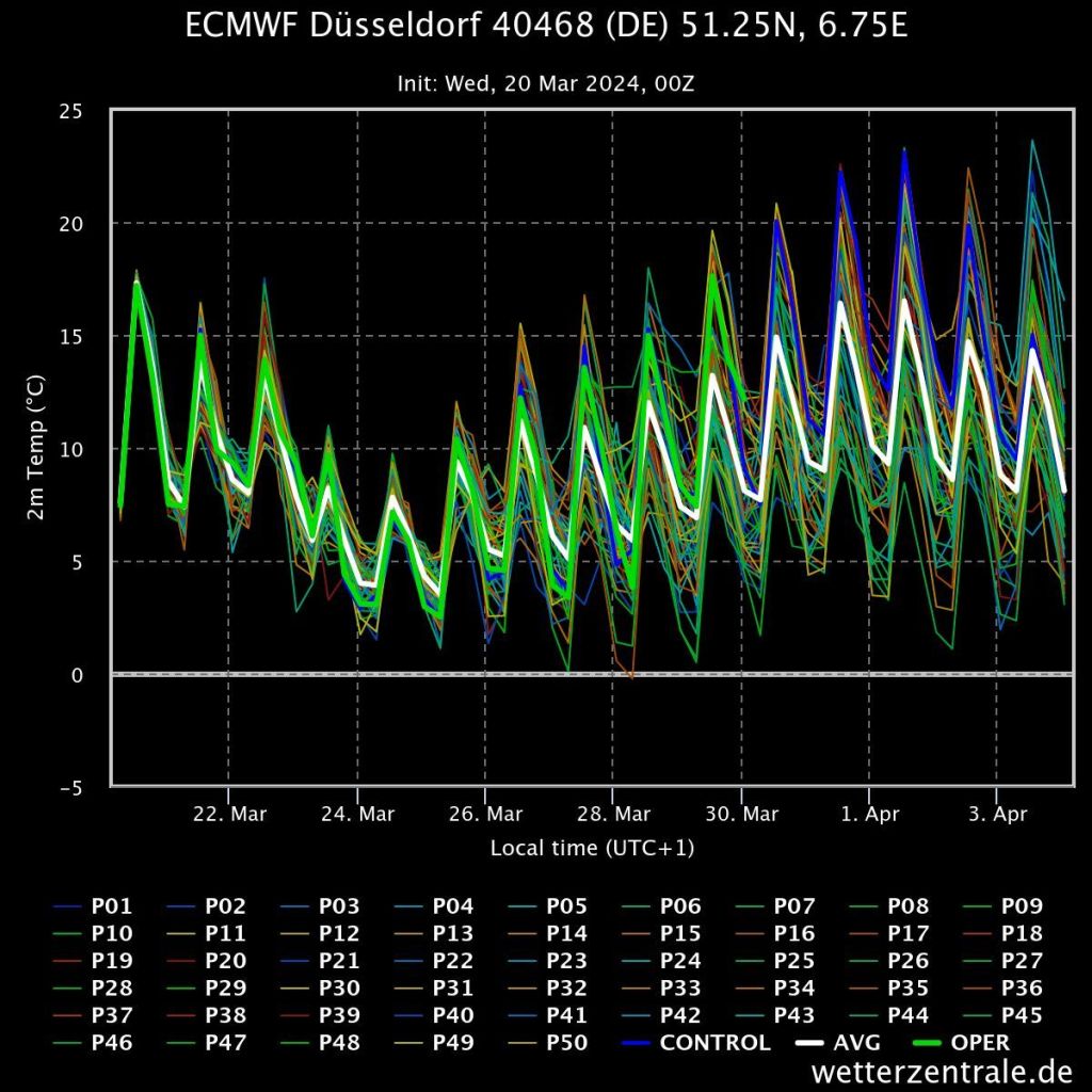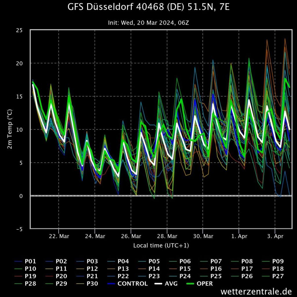Wie sieht das dann bei uns am Erdboden aus? Das GFS macht Tiefstwerte von 4-12 °C, gemittelt 9 °C. Die Höchstwerte bewegen sich zwischen 7-21 °C, gemittelt 14 °C. Das ist an sich gar nicht so warm, dennoch ist das richtig Frühling nach den wärmeren Modellen. Danach gehen einzelne Modelle in Richtung 25 °C hoch.