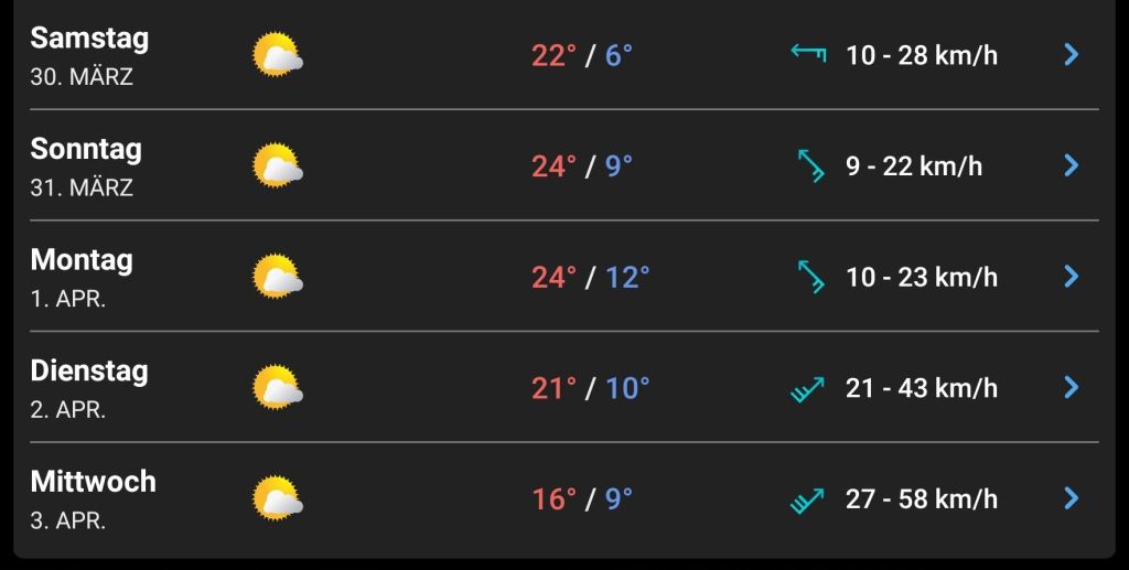 Das ECMWF hat die Range zum 1. April bei 3-15 °C und 8-23 °C als Tiefs und Höchstwerte, das Mittel bewegt sich bei 9-17 °C. Gemessen an der Luftmassentemperatur in 1.500 Meter Höhe wird es nach dem ECMWF einen Tick wärmer, wenn auch die wärmsten Laufe rund um diese Tage ebenfalls bei unter 25 °C gedeckelt ist. Und zum Abschluss noch ein Screenshot einer Wetterapp (Meteored).