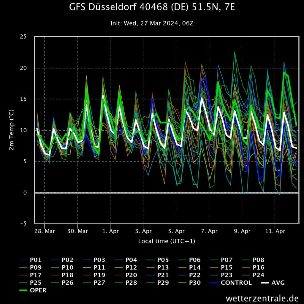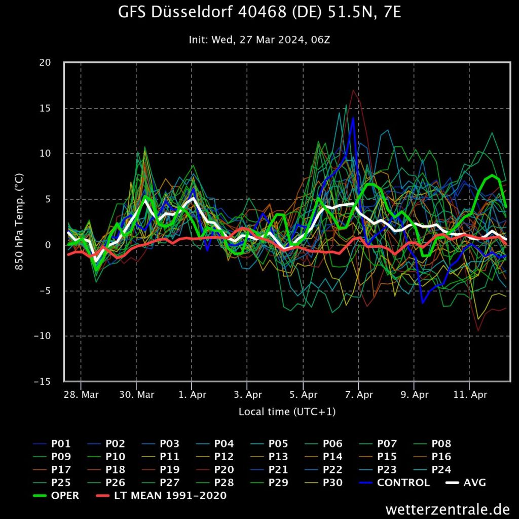Ab dem 4. April gibt es ein paar wenige Modelle, die kalte Temperaturen berechnen. Die Modelle gehen bis auf -6 °C in 1.500 Meter Höhe zurück, sprich +6 °C am Erdboden. Andere Modelle schießen förmlich nach oben, das Mittel steigt ähnlich wie zum Samstag auf +5 °C in 1.500 Meter Höhe, einzelne Modelle bringen erste Sommertage mit an die 17 °C in 1.500 Meter Höhe. Das ist jetzt aber noch recht spekulativ, das soll erst morgen Thema sein.
