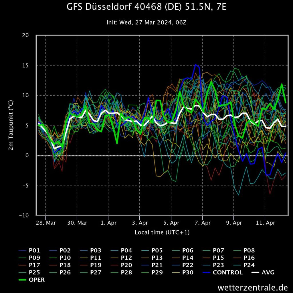 Um das ganze noch zu komplettieren, möchte ich noch kurz auf den Taupunkt verweisen. Wenn der Taupunkt hoch ist, ist die Luft warm und feucht. Ist der Taupunkt niedrig, so ist die Luft eher kühl und trocken. Trocken ist das Stichwort, wenn nur ein paar Läufe gehen deutlich zurück nach dem 4. April, womit eine trockene Variante der ersten Aprilhälfte unwahrscheinlich ist.