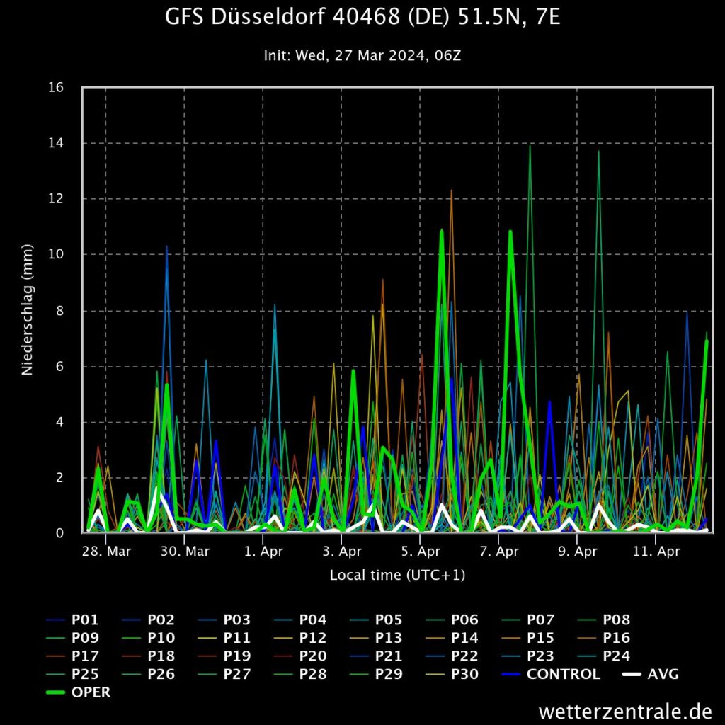 Auffällig für die kommenden 16 Tage sind die Niederschlagssignale. Die sind über den gesamten Zeitraum ziemlich aktiv, sodass wir immer wieder mit Schauer rechnen müssen. Auch hier wird die Großwetterlage entscheidend sein, da sich eine Wetterlage einstellen wird, die von Nordwesten her Tiefdruck bringt und damit auch Höhenkaltluft zu uns schickt. Solange diese Zone der Höhenkaltluft über uns liegt, bleibt es auch bei dem Schauerwetter. Der Hauptlauf des amerikanischen GFS berechnet bis zum 10. April derweil 70 Liter pro m².