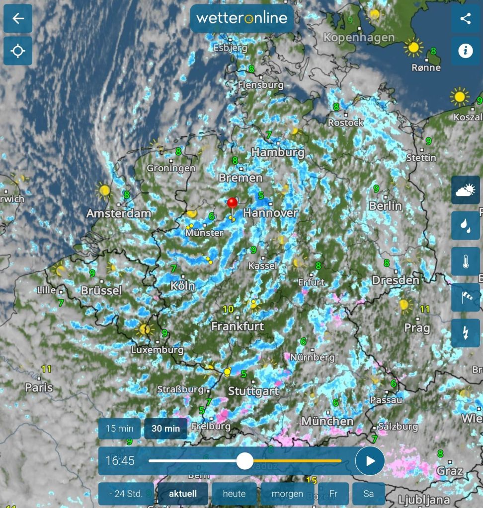 Mit Blick auf das Zentrum bei Bremen sieht man schön die vom Zentrum ausgehenden spiralförmigen Schauerbänder. Dazwischen die wolkenlosen Gebiete, eben durch die Höhenkaltluft ausgelöst.