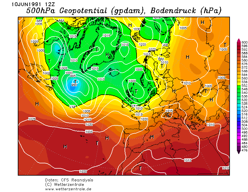 Die Großwetterlage vom 10. Juni 1995 zeigt ein nach Norden ausgewichendes Azorenhoch und ein Höhentief über der Nordsee mit kühlen Temperaturen und immer wieder Regen.