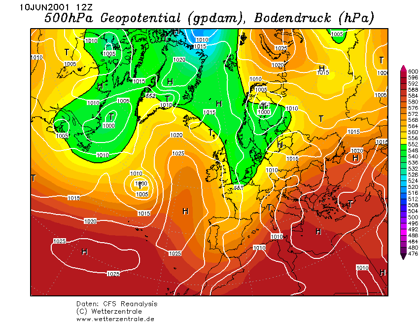 Die Großwetterlage zum 10. Juni 2001 zeigt ein Hoch bei den Azoren mit einem Ablegerhoch über dem Nordatlantik. Über Mitteleuropa machte sich hingegen Tiefdruck breit, insbesondere in der Höhe mit kühlen Temperaturen und Niederschlag.