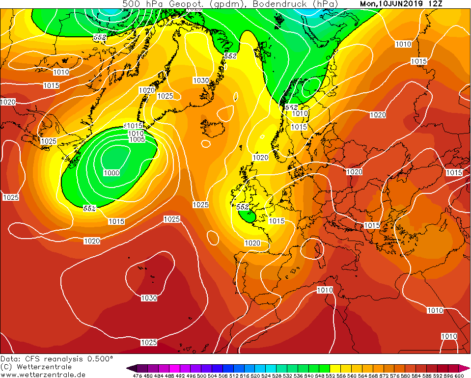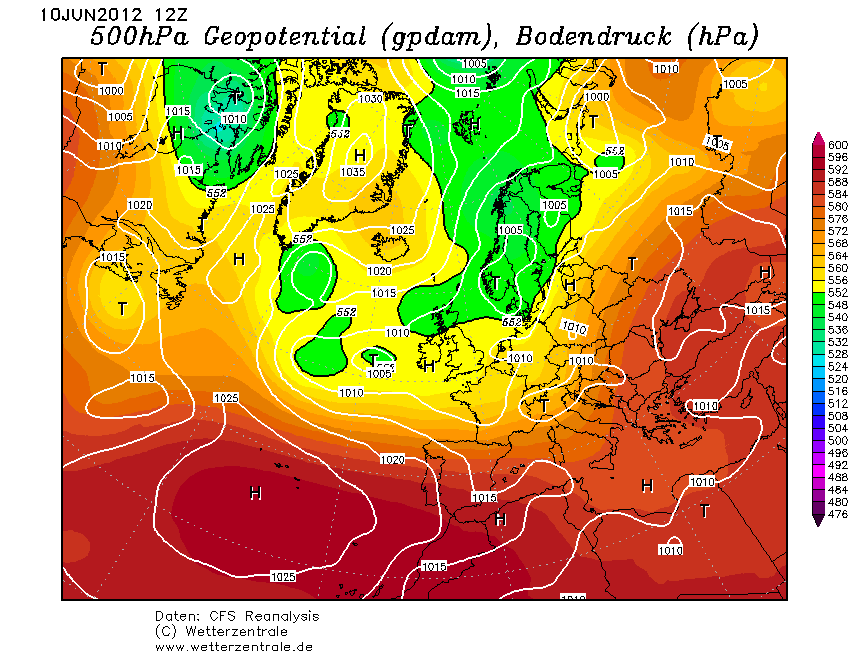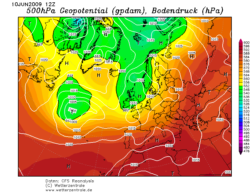 Am 10. Juni 2009 gab es ein nach Süden verlagertes Azorenhoch mit einem Keil bis in den Mittelmeerraum. Außerdem noch ein schwaches Hoch bei Island. Über der Nordsee tummelten sich die Höhentiefs mit kühler Luft und immer wieder Niederschlag inkl. Luftmassengrenze.