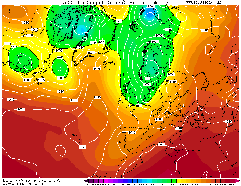 Am 10. Juni 2024 hatten wir es mit einem kräftigen Azorenhoch mit einem Keil nach Island zu tun gehabt, auf der Ostseite davon Tiefdruck mit einem großen Tiefdrucksystem und einem Höhenkaltluftvorstoß bis zu uns, was uns Schauer bringt. Der Kaltluftvorstoß reicht bis nach Spanien und in den Mittelmeerraum.