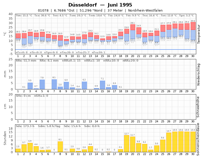Ein weiterer kalter Juni liegt aus dem Jahre 1995 zurück, mit 15,5 °C lag das Mittel des Monats im langjährigen Mittel der Jahre 1971-1980. Der Monat startete sehr kalt und regnerisch, wurde ab dem 19. Juni 1995 deutlich wärmer, trocken und sonnig.