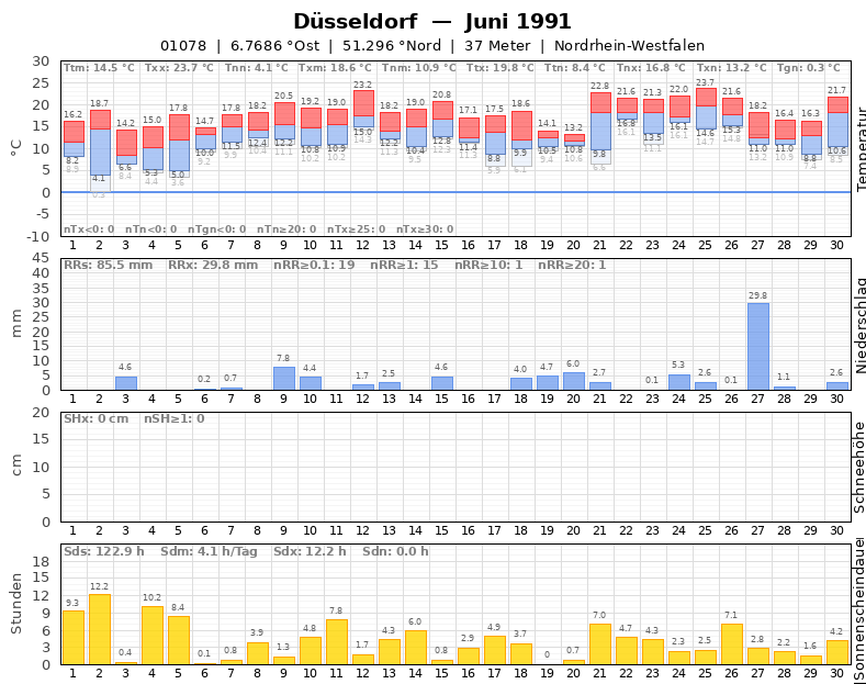Der Juni 1991 war mit durchschnittlich 14,5 °C ein äußerst kühler Juni und brachte keinen einzigen Sommertag mit >25,0 °C zustande. Zudem immer wieder Regen und äußerst trüb.