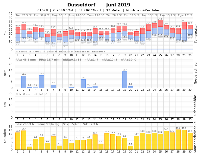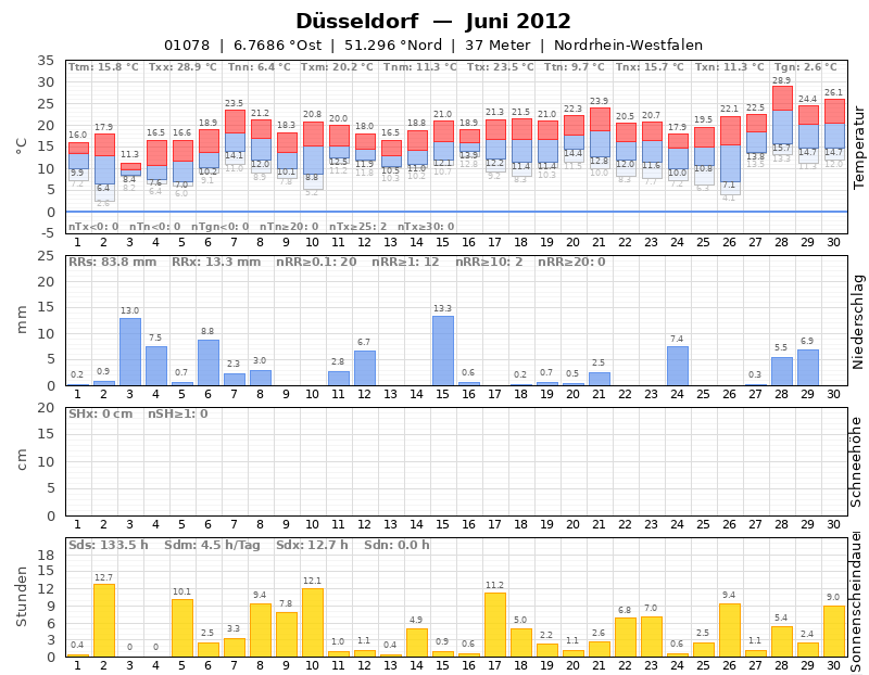 Zu guter Letzt der Juni 2012 als der letzte kühlere Juni der vergangenen Jahre mit einer Tagesmitteltemperatur von 15,8 °C. Dazu immer wieder Regen und einer durchschnittlichen Sonnenscheindauer von 4,5 Stunden pro Tag.