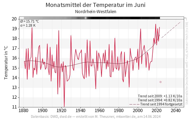 Beginnen möchte ich mit dem Klima. Das Klima lässt sich gut beschreiben als eine Form der statistischen Auswertung der einzelnen Messwerte auf unserer Erde. Am ehesten werden die Messwerte Temperatur, Niederschlag und Sonnenscheindauer genommen. In dem Diagramm oberhalb dieses Absatzes erkennt ihr die Monatsmitteltemperaturen der einzelnen Junimonate seit Aufzeichnungsbeginn 1881. Dabei sind die Temperaturen gemittelt für Nordrhein-Westfalen. Die einzelnen Striche rauf und runter zeigen die einzelnen Junimonate, die dunkelrote Linie zeigt das Mittel aus den vorherigen 10 Junimonate. Diese rote Linie ist eine Form der Darstellung für Klima, die Veränderung der roten Linie ist die klimatische Auseinandersetzung im Verhältnis zu anderen Jahren. So lässt sich aus diesem Diagramm erkennen, dass die mittleren Temperaturen im Juni seit 1980 von 15,5 °C um 3 °C auf heute 18,5 °C angestiegen sind. Tendenz weiter steigend.