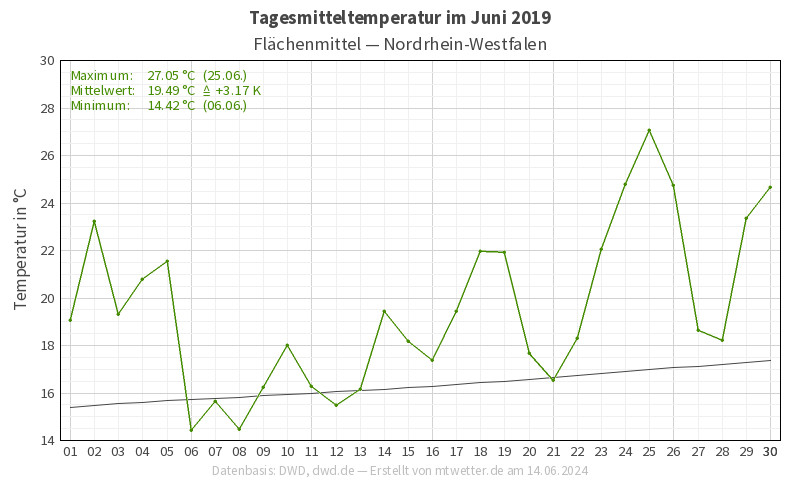 Im Vergleich zum neuen Klimamittel sieht man die Einbeulung der Temperaturen in dem besagten Zeitraum ganz gut, zu Beginn und gerade zum Ende des Junis 2019 mitunter große Hitze.
