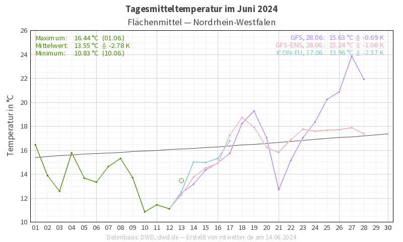 Im Vergleich dazu die Temperaturkurve des diesjährigen Junis. Auch hier ist die Schafskälte deutlich sichtbar, dem letzten Mal nach dem Winter, an dem die Polarluft nochmal nach Mitteleuropa gezogen ist. Danach ist sie nicht mehr so kalt, weil der hohe Sonnenstand die restliche Kälte am Nordpol erwärmt hat. Vom heutigen Tage an wird es wieder deutlich wärmer werden, der Hauptlauf tanzt derzeit häufiger mal im Hitzebereich herum. Das schaue ich mir später genauer mal an.
