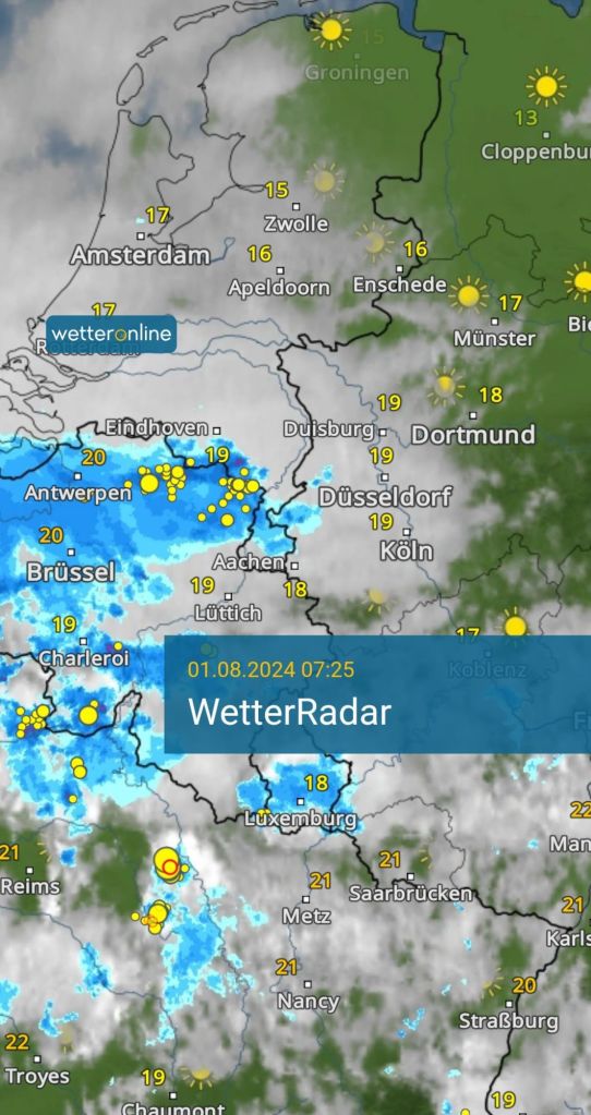 von Westen her ziehen aktuell Schauer und vereinzelt leichte Gewitter auf, die sich von Nordfrankreich und den Benelux Ländern zu uns ausbreiten. Ab etwa 8:30 – 9:00 Uhr wird uns dieser Klopps erreichen, dann wird es teils starken Regen in Begleitung von Blitz und Donner geben. Die Gewitterzellen, die ihr auf dem Radarbild im nordöstlichen Belgien seht, werden wohl nördlich an Düsseldorf vorbeiziehen, der südliche Teil dieses Regengebietes sowie die entstehenden Schauer südlich von Brüssel werden uns am Vormittag und Mittag beschäftigen. Ich behalte die Lage mal im Auge, aktuell ist nicht von Unwettergefahr auszugehen.
