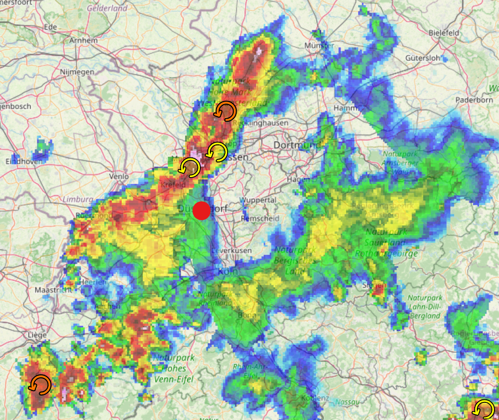 Wir liegen genau dazwischen und der südliche Teil dieses Gewitterbandes erreicht uns nun in den kommenden Minuten mit stärkeren Regen zwischen 19-20 Uhr. Es kann auch sein, dass sich dieser Teil noch gewittrig intensiviert, nach aktuellem Stand wird es aber keine Unwettergefahr für Düsseldorf geben. Gleiches gilt für die Regionen von Grevenbroich über Dormagen bis nach Neuss und von Hilden und Erkrath über Mettmann und Ratingen bis nach Velbert.