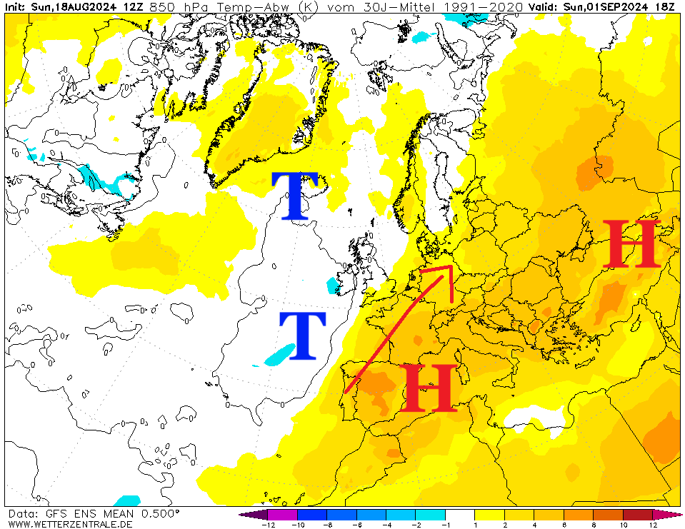 Die gemittelte Großwetterlage sieht derzeit einen von Tiefdruck geprägten Nordatlantik, allen voran durch ein Tief bei Island und schwachem Höhentief vor Südwesteuropa. Damit soll eine südwestliche Strömung in Gang gesetzt werden, mit der spätsommerliche Luft zu uns gepumpt werden soll. Auf der Gegenseite dominiert Hochdruck über dem Mittelmeerraum sowie über Osteuropa. Das ist jetzt zumindest das, was das Mittel hergibt, der Hauptlauf des amerikanischen GFS sieht das Hoch über Polen und ein Tief über Italien, womit die Gesamtwetterlage etwas instabiler wirken dürfte.