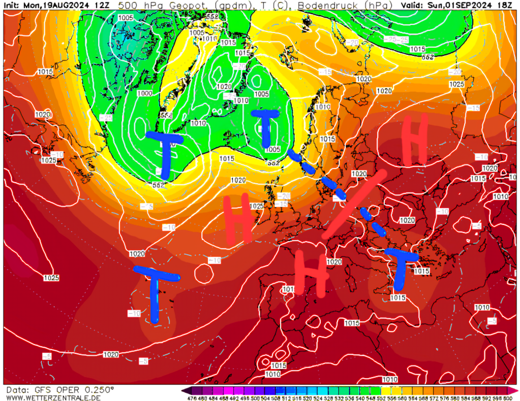 Die Wetterlage ist zwar relativ stabil, aber auch wenn das Hoch von Südwesteuropa und das Hoch von Osteuropa eine Hochachse aufbauen, bleibt die Wetterlage auf wackeligen Beinen, da auf der Gegenseite ein Tief über dem Nordmeer und ein Tief über Italien zumindest in der Höhe eine Tiefachse andeuten. Und diese Konstellation ist recht spannend, auch wenn der Großteil der Modelle die Hochachse und somit das spätsommerliche Wetter als wahrscheinlicher erachten.
