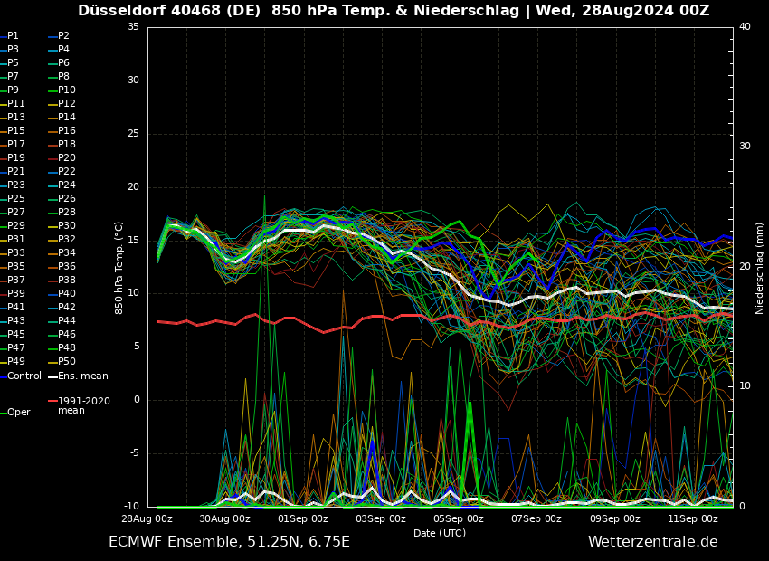 Anhand der Niederschlagssignale am unteren Rand des Diagramms zeigt sich ein erhöhtes Schauer- und Gewitterrisiko für den Zeitraum 30.08. (Freitag) bis 05.09. (Freitag nächster Woche). Da sind einzelne Modelle dabei, die auch mal 30 Liter pro m² binnen 6 Stunden berechnen, was dann für schleifende Gewitterfronten sprechen würde. Allgemein scheint die Unwettergefahr aber gering zu sein, da keine Luftmassengrenzen im Raum stehen. Mehr dazu dann aber wie gesagt morgen.