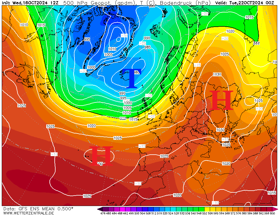 Bis zum Dienstag nächster Woche wird zwar die Hochdruckachse zwischen dem Hoch über den Azoren und dem Osteuropa-Hoch kaum abgehobelt werden, aber man erkennt zumindest aufgrund der Schattierung aus Nordwest einen leichten Rückgang des Geopotentials, sodass die Labilität des Wetters langsam zunimmt.