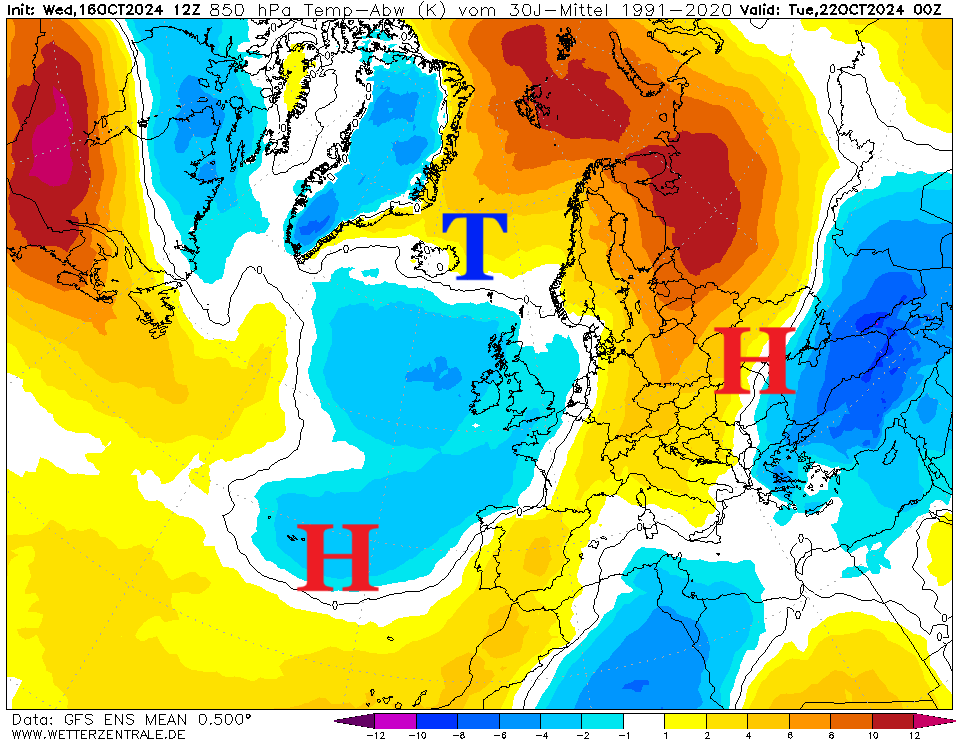 Vom Tief bei Island ausgehend sieht man die der Jahreszeit entsprechend kühlere Luft vom Nordatlantik in Richtung Mitteleuropa ziehen und diese wird zur Mitte der nächsten Woche dann auch uns wieder erreichen.