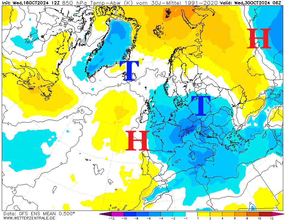 Die Temperaturen gehen dann deutlich zurück, bei uns zum Teil -3 bis -5 °C unter den Temperaturen des langjährigen Mittels aus den Jahren 1991 bis 2020. Aus dieser Konstellation mit Tief über der Ostsee und Hoch über dem Nordatlantik dreht die Luft bei uns zunehmend auf nördliche Richtungen und das könnte für einen ersten markanten Wintereinbruch in Hochlagen und bei uns im Flachland für erste frostige Nächte sowie kühle einstellige Werte sorgen. Dazu wird das Ganze stetig mit Niederschlag begleitet werden, eine nasskalte Witterungsphase könnte uns somit zum Ende des Monats bevorstehen, wie gestern bereits im Diagramm zu erahnen war.