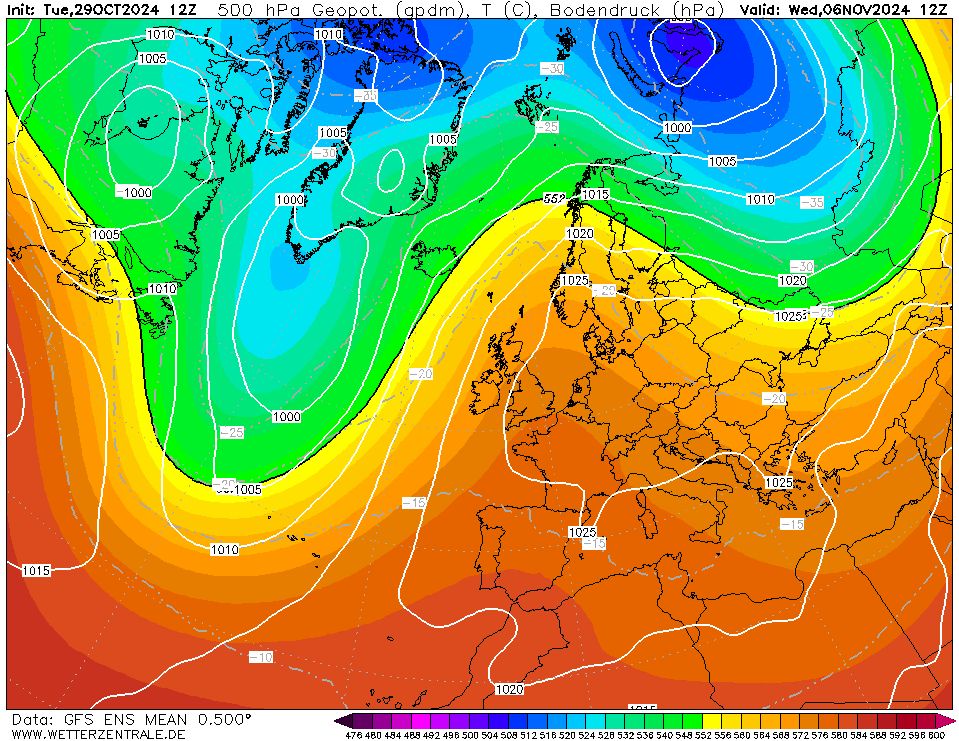 Wie bereits gestern angedeutet ist der Polarvorstoß weggerechnet worden und stattdessen übernimmt wieder der Hochdruck. Auf dem Bild ist das Bodenhoch sehr gut zu erkennen durch seine großräumige Blase von 1025 hPa (weiße Linie, die das Hoch umrandet), welche sich von Osteuropa über Südskandinavien und dem Mittelmeerraum bis an den Atlantik und Großbritannien erstreckt. Durch die Schattierungen zeigt sich anhand der orangenen Farbe zudem ein Höhenhoch bis nach Frankreich. Wir liegen mit dem Boden- und dem Höhenhoch ziemlich genau darunter und entsprechend ruhig wird das Wetter bei uns ablaufen. Dazu liegt die gemittelte Luftmassentemperatur in 1.500 Meter Höhe bei 6 °C, sodass erneut wieder eine Inversionswetterlage entsteht und wir im Prinzip genau das gleiche Wetter haben werden, wie wir es nun an den kommenden Tagen erwarten können.