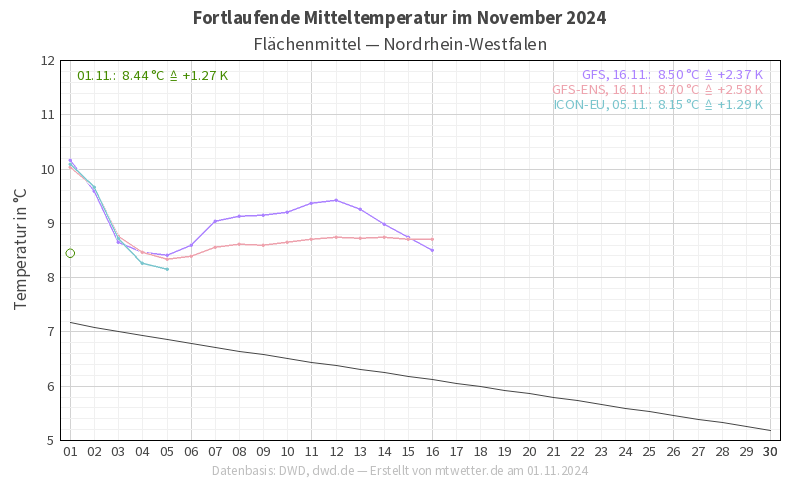 Mit Blick auf die Berechnungen des amerikanischen Wettermodells mit seinem Hauptlauf sowie seinem Mittel wird uns die erste Novemberhälfte weiterhin milde Temperaturen bringen. Es gibt zwar einzelne Modelle, die rund um den 11. November erste Kaltlufteinbrüche aus dem Norden berechnen, der große Teil bleibt aber weiter mild und weitestgehend trocken. Im Hinblick auf das, was der Polarwirbel aktuell so von sich gibt, könnte es gerade ab Ende November einen ersten markanten Wintereinbruch geben. Ich bleibe dran.