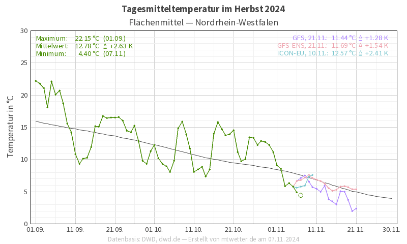Heute werfen wir mal einen kurzen Blick auf unsere derzeitige Situation im Herbst. 2/3 des Herbstes sind bereits rum und wir sind im letzten Vollherbst-Monat angekommen. Bisher wechselten sich über den Herbst hinweg immer wieder wärmere und kühlere Phasen ab, nun kommen wir wieder in eine kühlere Phase. Im Vergleich der Tage 1.9. bis 6.11. und dem Mittel der Tage aus den Jahren 1991 bis 2020 liegen wir aktuell bei einem Plus von 1,37 °C und dieser Wert wird sich im Verlauf der kommenden 2 Wochen in Richtung 1,24 °C reduzieren. Was die Niederschlags-Abweichung angeht liegen wir mit dem heutigen Tag wieder unterdurchschnittlich bei 98,35 %, in den vergangenen 3 Novemberwochen werden wir vermutlich in Richtung des langjährigen Mittels kommen. Was die Sonnenscheindauer angeht sind wir derzeit voll im Soll bei 103,5 %, da werden wir in Anbetracht der Großwetterlagen der kommenden Wochen vermutlich leicht unterdurchschnittlich landen.