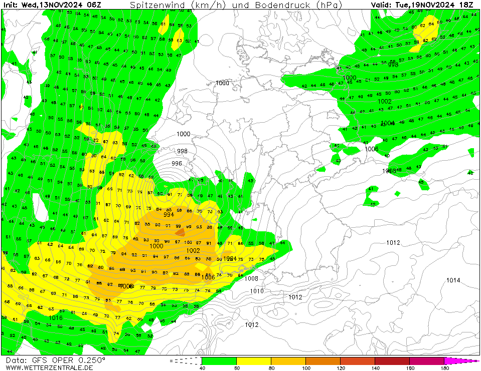 Bevor der Bericht nun zu lange wird, kurz ein Update zu den Modellen bzgl. des Windes Mitte nächster Woche. Dieses Sturmtief wird nun weiter südlich berechnet mit seinem Kern über der Eifel, was bei uns weniger Wind, dafür mehr Regen bedeuten würde. Mehr dazu dann Freitag.