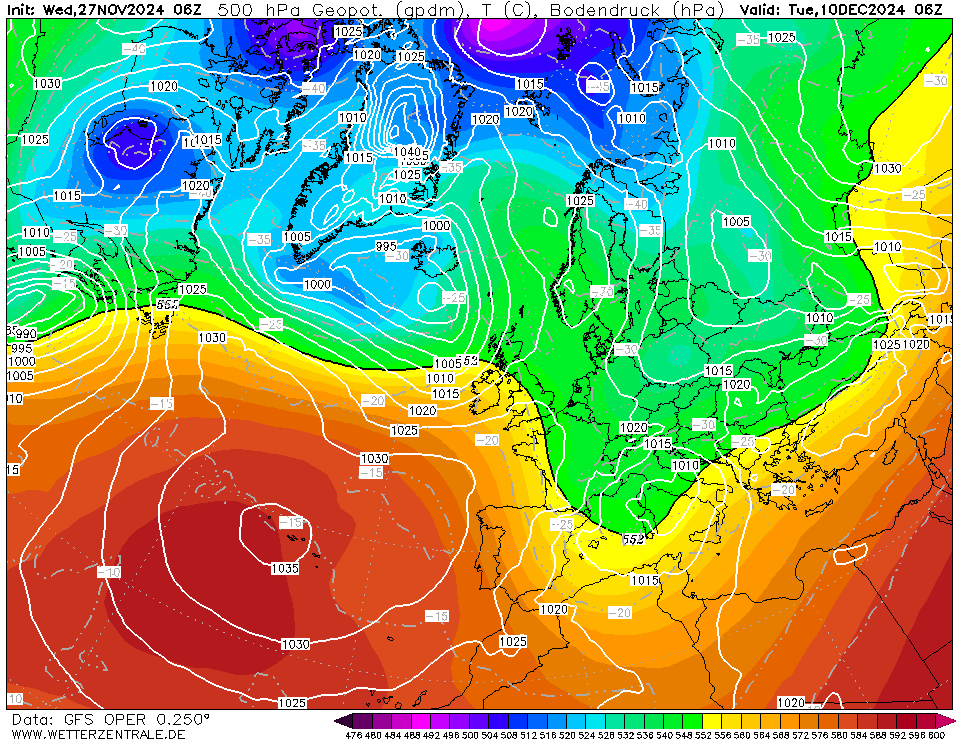 Aktuell ringen die Wettermodelle um eine Bestehung der „Sumpflage“, die sich in der kommenden Woche aufbauen soll mit nasskaltem Schmuddelwetter mit Schauern, kühlen Temperaturen und hin und wieder etwas Wind. Dabei neigt das über dem Atlantik befindliche Hoch über den Azoren immer wieder dazu nach Norden aufzublähen und den Atlantik zu Blocken. Damit würde der Wind nicht mehr von West kommen und mildere Temperaturen bringen, sondern aus dem Norden mit Tiefdruck und hoher Feuchtigkeit, sodass sich immer wieder Schauer mit zeitweise Schnee im Gepäck zu uns aufmachen würden. Dies wird zwar nicht verbreitet berechnet, aber immer wieder und somit können wir zumindest mal für den Hinterkopf behalten, dass es ab der zweiten Dezemberwoche nochmal winterlich werden könnte. Bis dahin bleibt es ruhig und usselig.