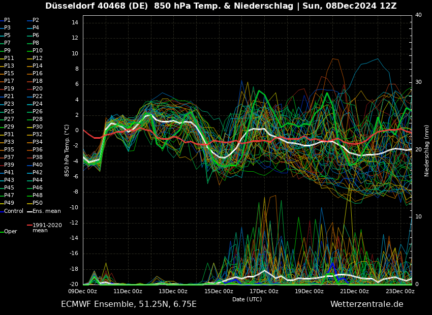 Anhand des Ensembles können wir ganz gut die verschiedenen Wetterphasen bis zum 15. Dezember erkennen. Wir starten kalt und mit Niederschlag (heute), danach steigen die Temperaturen in 1.500 Meter auf 2 °C an, ohne Niederschlag. Dahinter liegt ein Hoch, die Luft kommt zur Ruhe und es entsteht eine Inversionswetterlage mit Hochnebel und auskühlenden Bodentemperaturen. Danach gehen die Temperaturen wieder deutlich zurück und es kommt etwas Regen auf. Das ist das Tief, was ich oben angesprochen hatte.