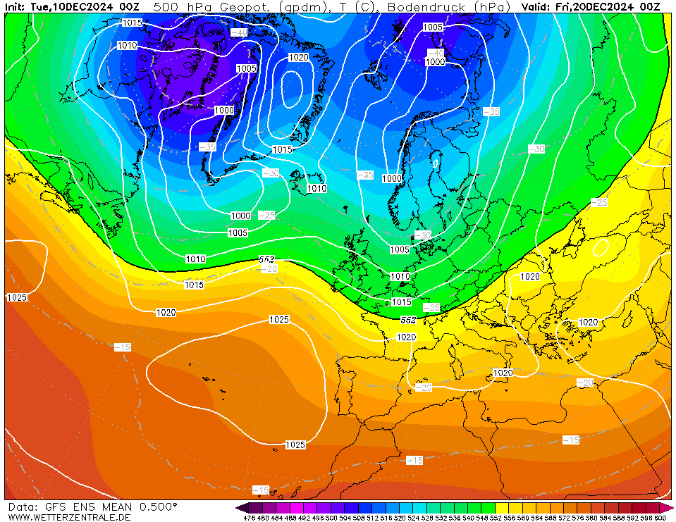 Die gemittelte Großwetterlage zum 20. Dezember zeigt uns ein Tief westlich von Island sowie ein steuerndes Tief über Nordskandinavien mit einem Trogvorstoß in der Höhe über Mitteleuropa und somit auch über uns. Das Azorenhoch ist dabei, wo es hingehört und das Kontinentalhoch ebenso. Eine klassische Wetterlage, bei dem der Wind von West kommt mit einem Wechsel von nasskalt und milderen Phasen mit Wind. Kommt ein Hoch drüber, setzt sich die Kälte und Feuchtigkeit und es bildet sich Nebel und Hochnebel.