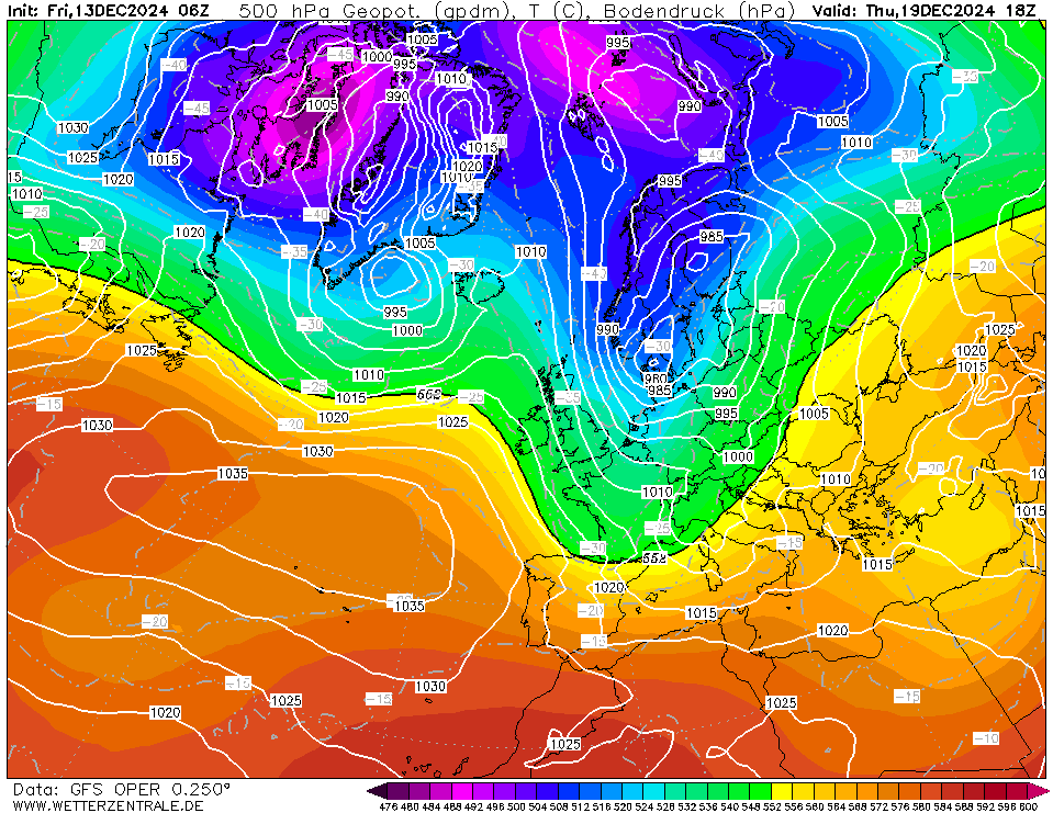 So gestaltet sich aktuell die Großwetterlage nach dem amerikanischen GFS für den kommenden Donnerstag. Das zwischenzeitliche Hoch, welches sich am Wochenende über das südliche Mitteleuropa legt und die milde Luft mit Wind bringt, verschwindet wieder und der Tiefdruck aus dem Norden bricht wieder durch mit eine Trogvorstoß in 5.500 Meter Höhe und einer Höhenkaltluft von unter -30 °C. Das Azorenhoch ist wieder dort, wo es hingehört und das Islandtief liegt westlich von Island. Die Farbschattierung schauen wir uns an dieser Stelle mal etwas genauer an, denn es gibt eine leichte Beule des Geopotentials in 5.500 Meter Höhe, sodass sich ganz minimal ein Aufbau eines Hochs andeuten könnte.