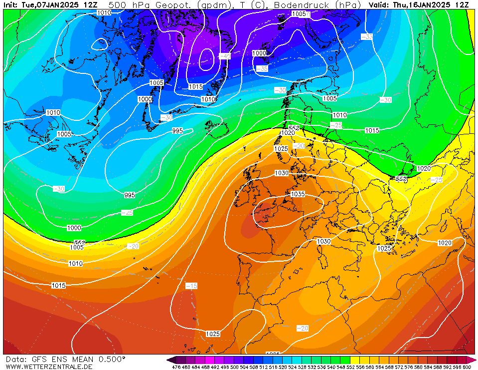 Mit dem Hoch, welches am Wochenende aufzieht, kommt dann der Deckel drauf. Das amerikanische Wettermodell sieht mit seiner gemittelten Berechnung das Hoch genau über Mitteleuropa mit einer schwachen West- bis Südwestströmung. Im Winter, wenn kein Wind herrscht, ist es am Boden dann kalt. Mit der Vorgeschichte und teils frostigen Nächten kann das auch mal Dauerfrost heißen. Und dieses Hoch könnte uns etwas länger erhalten bleiben.