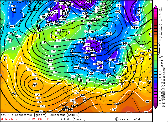 Während wir gemäß dem langjährigen Mittel aus den Jahren 1991 bis 2020 statistisch gesehen aktuell die kältesten Tage des Jahres haben, ist der Monat Februar allgemein dafür bekannt, nochmal einen Kälteeinbruch aus Nordost zu bringen. Zuletzt war eine klassische Nordostlage im Februar mit einem Hoch über Skandinavien und einer bodennah eisigen Ostströmung und Temperaturen bis -20 °C in 1.500 Meter Höhe am 28. Februar 2018. Dort sind die Temperaturen in Düsseldorf nachts auf -9,1 °C gesunken, so richtig eiskalt war es zuletzt nach einer solchen Lage am 4.2.2012 mit -13,3 °C in Düsseldorf, in Ueckermünde an der Mündung der Oder in die Ostsee ging es sogar auf -28,7 °C runter. Solche Lagen entstehen im Februar immer mal wieder.