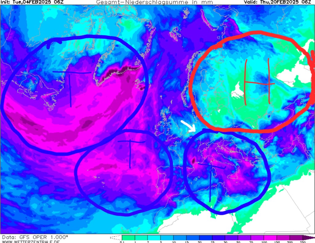 Mit Blick auf die Verteilung der Niederschläge lässt sich ganz gut erkennen, ob es in einem Gebiet eher tiefdruckgeprägt ist oder ob Hochdruck dominiert. So sehen wir gewisse Wasserstraßen von Kanada bis nach Grönland und Island (Tiefdruck), sowie einen breiten streifen vom Nordatlantik bis zur iberischen Halbinsel (Tiefdruck). Auf dem Kontinent dominiert Tiefdruck über Italien und Hochdruck über Nordosteuropa. Wir liegen im Prinzip genau dazwischen und werden es deshalb auch mit einer Sumpflage zu tun haben, die viele Wolken mit sich bringt, zwischendurch setzt sich auch mal die Sonne durch. Ab und zu bricht mal die Feuchtigkeit aus dem Südwesten durch und bringt abklingenden Regen, der vom Hochdruck quasi aufgefressen wird. Und so in etwa dürfte sich auch die Großwetterlage über die kommenden 2 Wochen halten, wie wir es auch gestern schon im Ensemble sehen konnten.