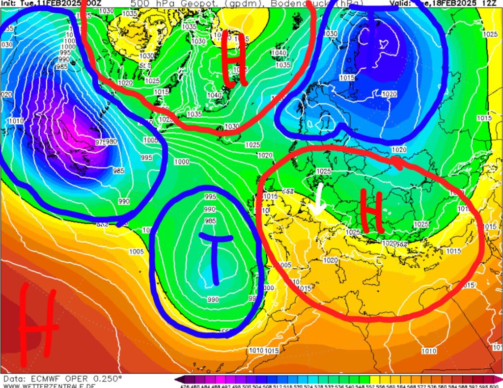 Diese Ostlage wird sich bis zum Beginn der folgenden Woche halten, dann stehen wir an einem Scheidepunkt für den Übergang in den meteorologischen Frühling. Dabei werden wir Dienstag nächster Woche eine Hochdruckbrücke von Osteuropa bis nach Grönland haben, wobei diese Hochdruckzone instabil ist durch das niedrige Geopotential in 5.500 Meter Höhe. Wetterbestimmend wird das Tief über Südwesteuropa sein, welches sich in die einstige Hochdruckzone eingräbt und eine südliche Strömung bei uns entfacht. Dieses Tief wird folglich zu uns ziehen mit milderen Temperaturen, Regen und Wind. Das sieht das amerikanische GFS genauso.