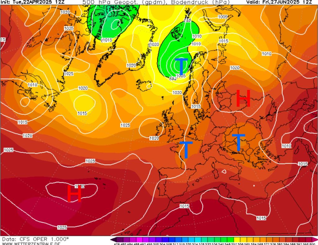 Dann schauen wir uns dazu mal die Großwetterlage dazu an. Da hätten wir ein stabiles Hoch über den Azoren, ein schwaches Kontinentalhoch und viele Höhentiefs über Mitteleuropa. Es ist die exakt gleiche Großwetterlage wie jetzt. Und wer jetzt sagt: „Ja und? Die Glaskugel wirft das in 10 Wochen aus.“, dem sei gesagt: Die Großwetterlage wird von allen 4 Läufen bis Mitte August so gerechnet, mal mit Keil des Azorenhochs über uns, dann wieder Tiefdruck in der Höhe mit kühlerer Nordluft und vielen Schauern und Gewittern. Mit dieser Großwetterlage kann es keine Hitze geben. Dass es mal einzelne heiße Tage geben kann, ist normal, es wird aber nicht die Regel sein können, weil die Großwetterlage keine ausgewachsene Hitzewelle aus Süd zulassen wird. Das europäische ECMWF mit seinem Langfristmodell deutet auf genau die gleiche Konstellation hin mit Azorenhoch, Keil des Azorenhoch zu uns mit ausgeglichenen Niederschlägen, klassisch in Form von Schauern und Gewittern durch Höhentiefs aus Nordwest. Damit auch häufig Wind aus Nordwest und West, damit kann es keine Dauerhitze geben.