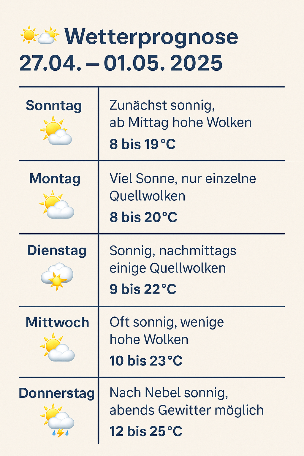 Der Start in den Mai beginnt zunächst mit Frühnebel, der sich rasch auflöst. Danach viel Sonne und frühsommerliche 12 bis 25 °C. Im Tagesverlauf nimmt das Schauer- und Gewitterrisiko etwas zu – erste Wärmegewitter könnten ab dem Nachmittag entstehen.