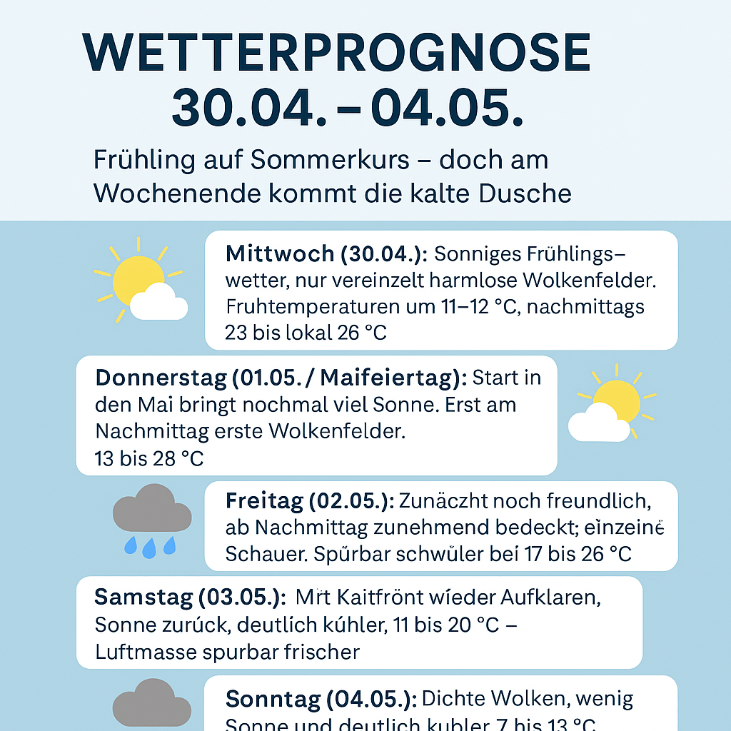 Der April verabschiedet sich mit viel Sonne und teils sommerlichen Temperaturen. Doch mit dem Start in den Mai beginnt ein spürbarer Wetterwechsel – die Kaltfront naht!